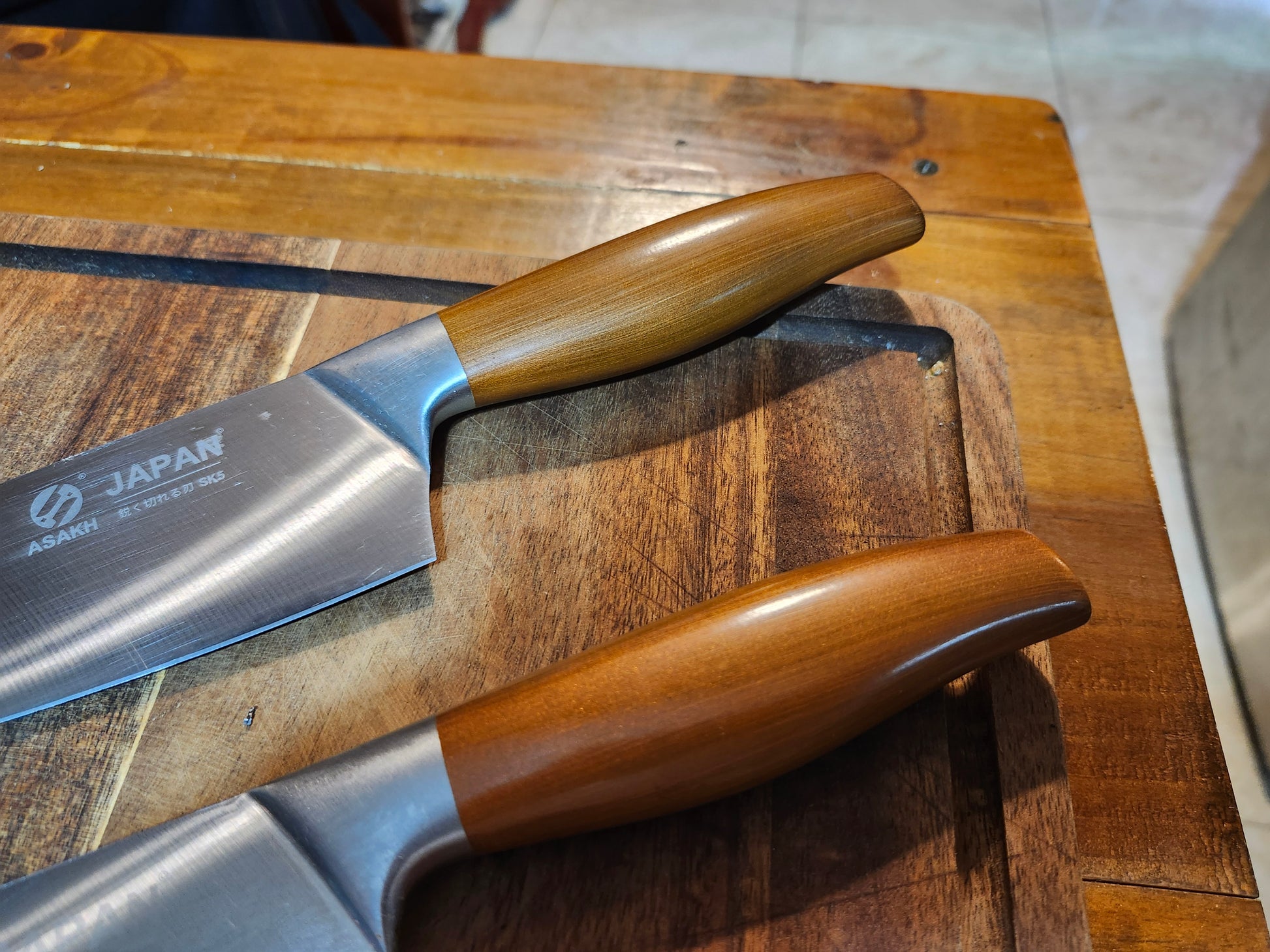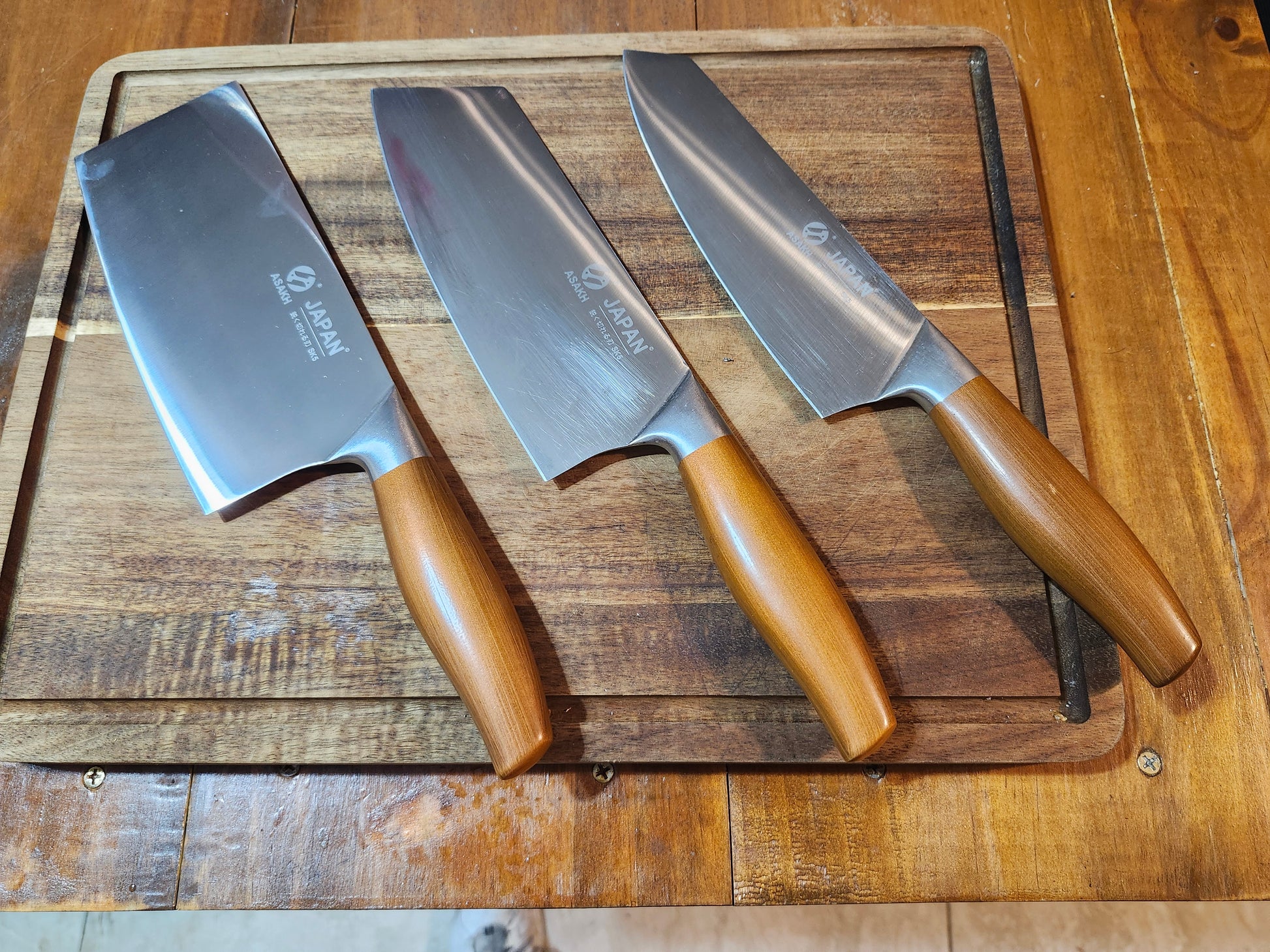Asakh Japan Trio - Butcher, Santoku, Kiritsuke, Stainless Steel. Includes protective sheaths. Clearance sales of alternative brands are final.