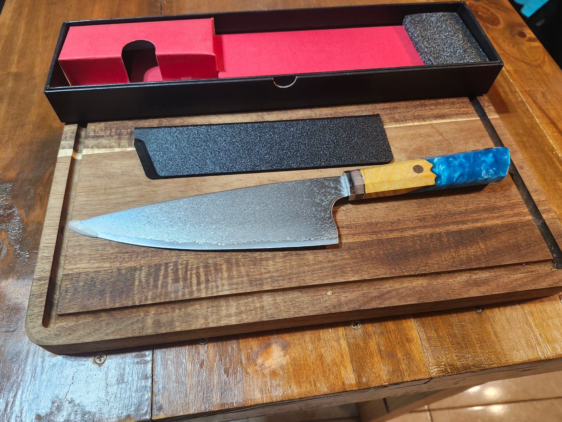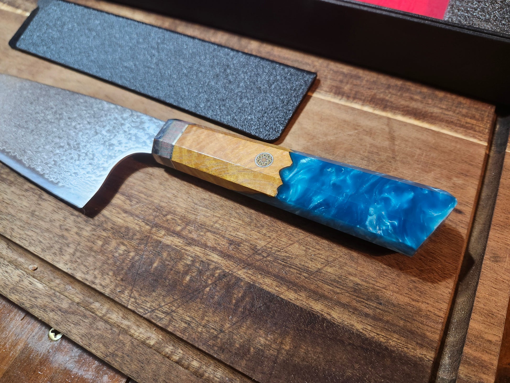 VG10 steel, Damascus pattern, HRC 58 +/- 2, 15-degree sharpness, resin and wood handle. Includes a protective sheath and a free sharpener. VG10, Damascus pattern, HRC 58 +/- 2, 15-degree sharpness, resin and wood handle. Clearance sales of alternative brands are final.