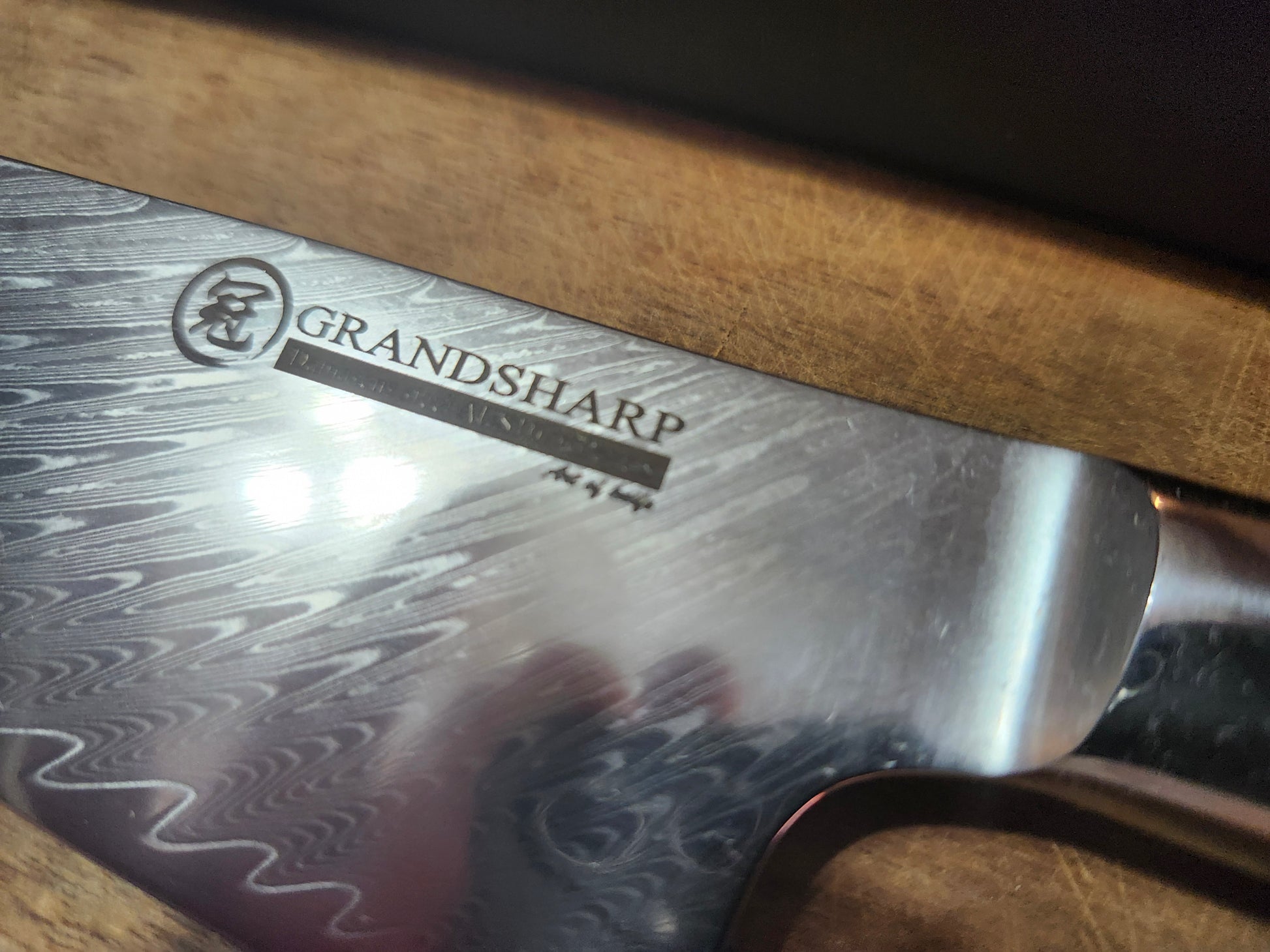 Grandsharp Chef/Gyuto, Damascus pattern, flat-ground VG10 steel core, 67 layers, heat-treated, wood and resin handle, HRC 60 +/- 2, 15-degree sharpness. Closeout sales of alternative brands are final.