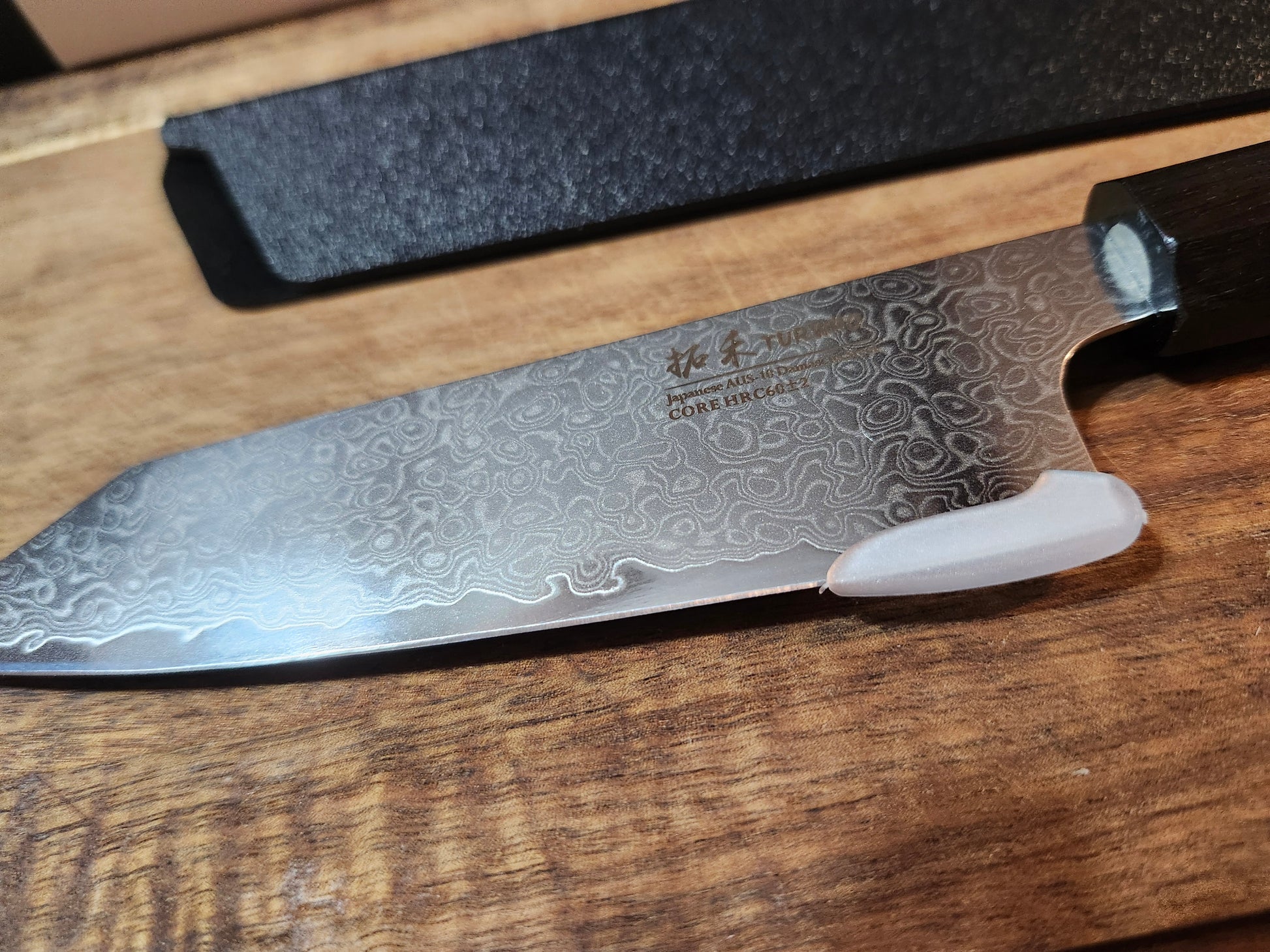 Turwho Bunka 5"/13cm 67-layer AUS10 Damascus steel, flat ground, 15-degree sharpness, HRC 60 +/- 2. Includes a protective sheath and a free sharpening. Clearance sales of alternative brands are final.