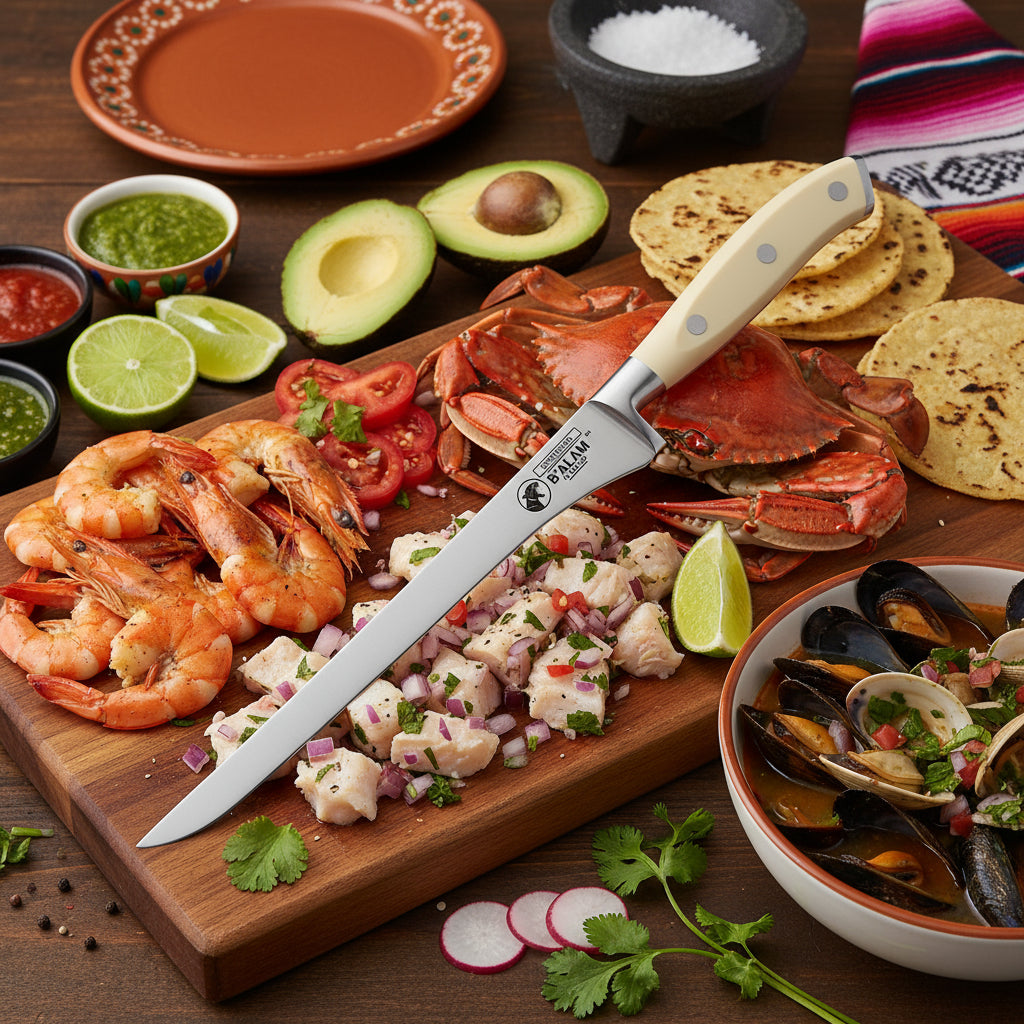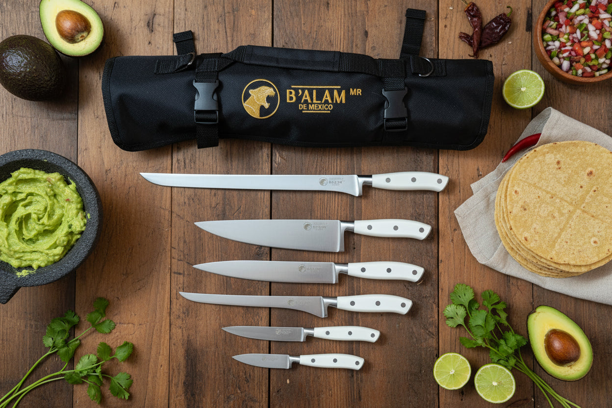 Enjoy the elegance and convenience of our Cepayahuitl Series. The Cepayahuitl Series comes with 6 knives: 8" Chef's, 11.5" Fillet, 8" Fillet, 8" Carver, 5" Utility, 3.5" Paring, protective sheaths, and gift boxes plus a free B'alam de Mexico estuche.